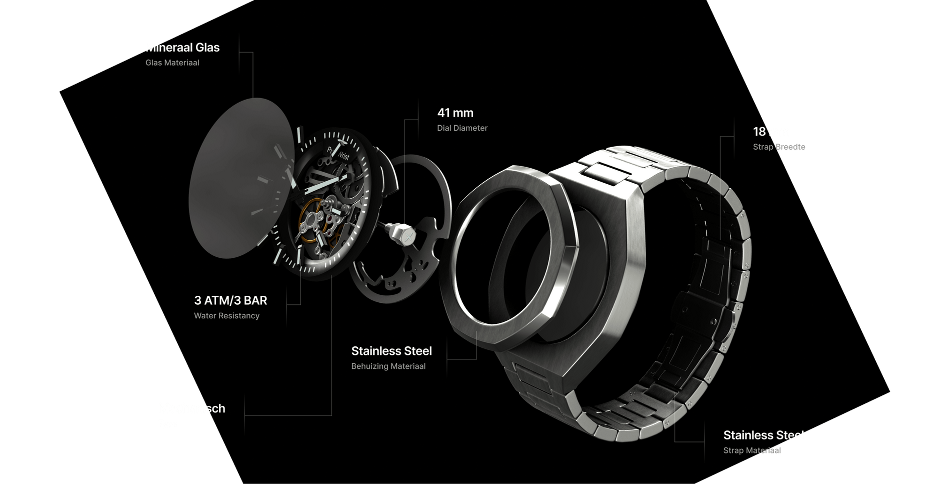 De opengewerkte wijzerplaat laat het binnenwerk subtiel zien – een stijlstatement voor wie oog heeft voor detail.